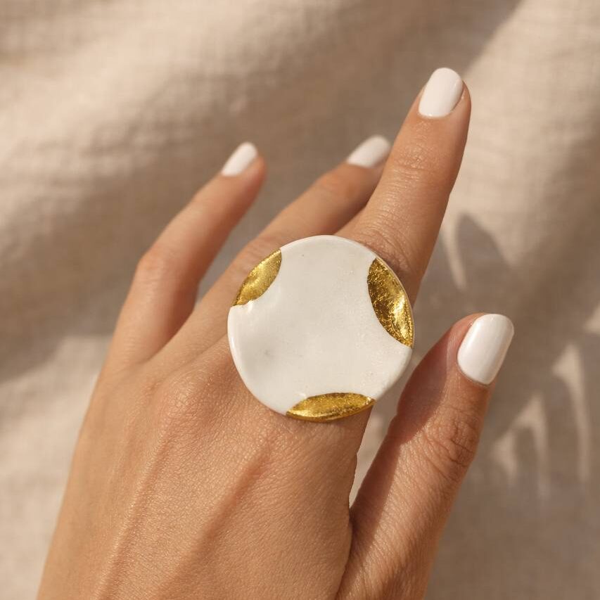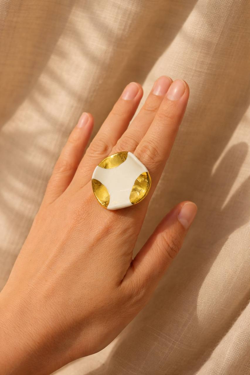 Este anillo de porcelana circular y con ligeras ondas está diseñado como un pequeño talismán cotidiano. La pieza central, fina y ligera, se modela en porcelana blanca y se cuece a alta temperatura para lograr una superficie suave y resistente, casi translúcida en los bordes. Sobre ella, tres toques en lustre de oro real se aplican a mano y se vuelven a cocer para fijar ese brillo cálido y sutil.