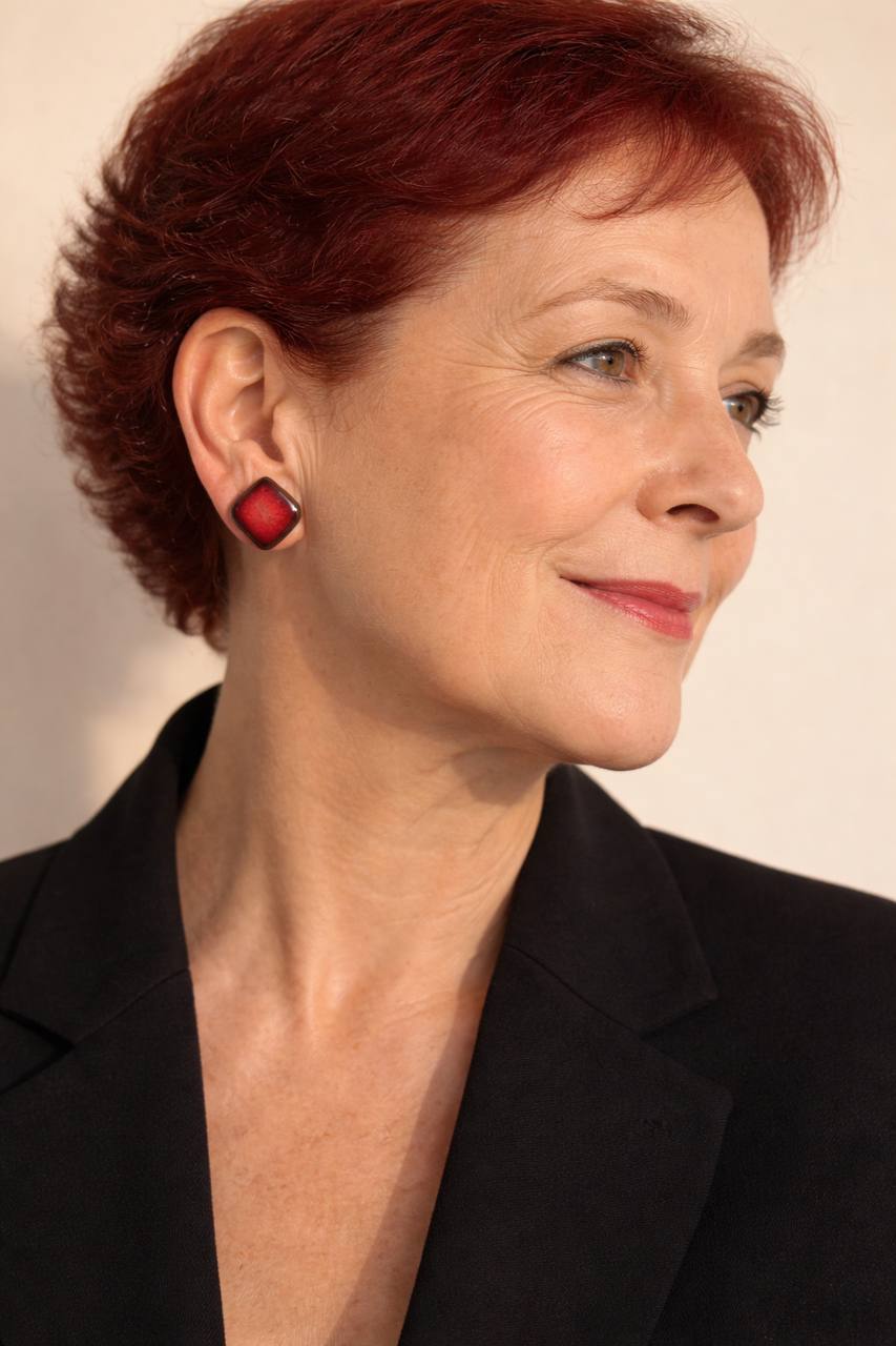 Pendiente de cerámica con una pequeña geometría de líneas firmes, esmaltada en rojo pasión.