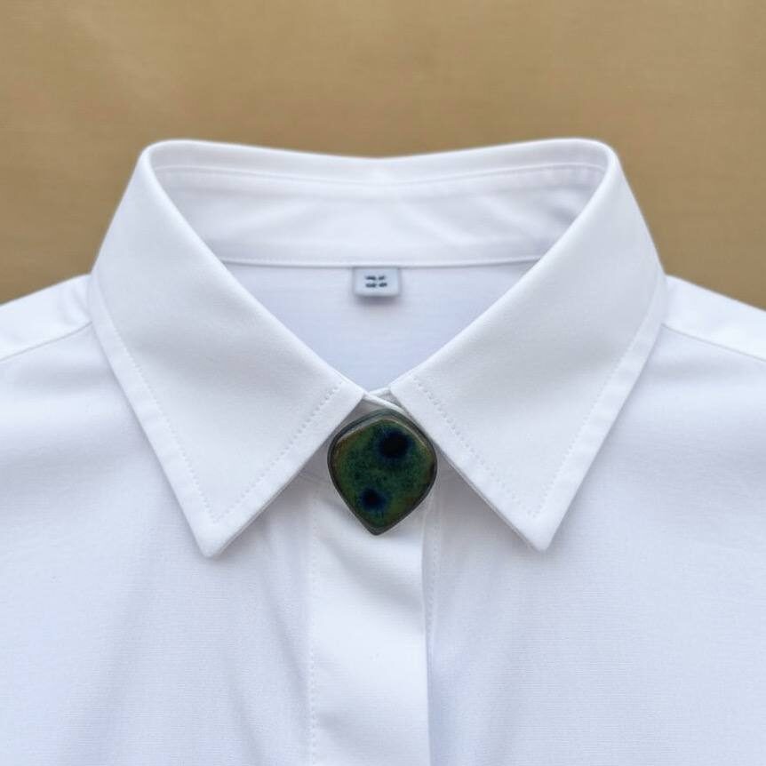 Este cubrebotón está realizado en cerámica negra, de acabado liso y elegante, que aporta un toque sofisticado y diferente a camisas, americanas o abrigos. Sobre la superficie, un esmalte verde turquesa intenso crea un contraste fuerte y contemporáneo, perfecto para quienes buscan un detalle pequeño pero muy llamativo.