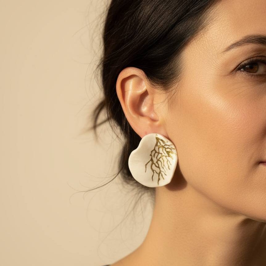 Estos pendientes de porcelana circulares con ligeras ondas orgánicas están diseñados como un pequeño talismán cotidiano. La pieza central, fina y ligera, se modela en porcelana blanca y se cuece a alta temperatura para lograr una superficie suave y resistente, casi translúcida en los bordes. Sobre ella, decoraciones con quiebres en lustre de oro real se aplican a mano y se vuelven a cocer para fijar ese brillo cálido y sutil. Tanto las ondas de la porcelana como los quiebres de oro pintado a mano siempre presentarán ligeras diferencias que hacen de estos pendientes piezas únicas e irrepetibles