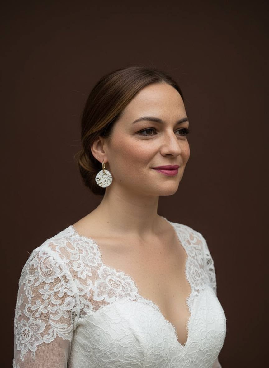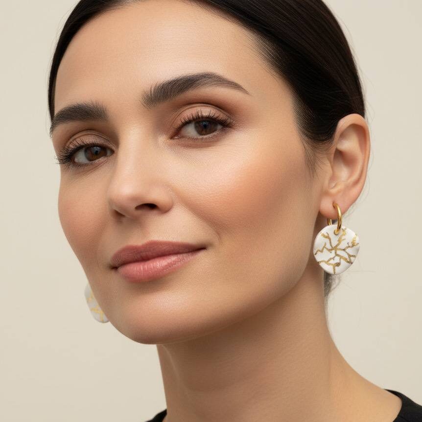 Estos pendientes de porcelana circulares con ligeras ondas orgánicas están diseñados como un pequeño talismán cotidiano. La pieza central, fina y ligera, se modela en porcelana blanca y se cuece a alta temperatura para lograr una superficie suave y resistente, casi translúcida en los bordes. Sobre ella, decoraciones con quiebres en lustre de oro se aplican a mano y se vuelven a cocer para fijar ese brillo cálido y sutil. Tanto las ondas de la porcelana como los quiebres de oro se realizan a mano siempre presentarán ligeras diferencias que hacen de estos pendientes piezas únicas e irrepetibles