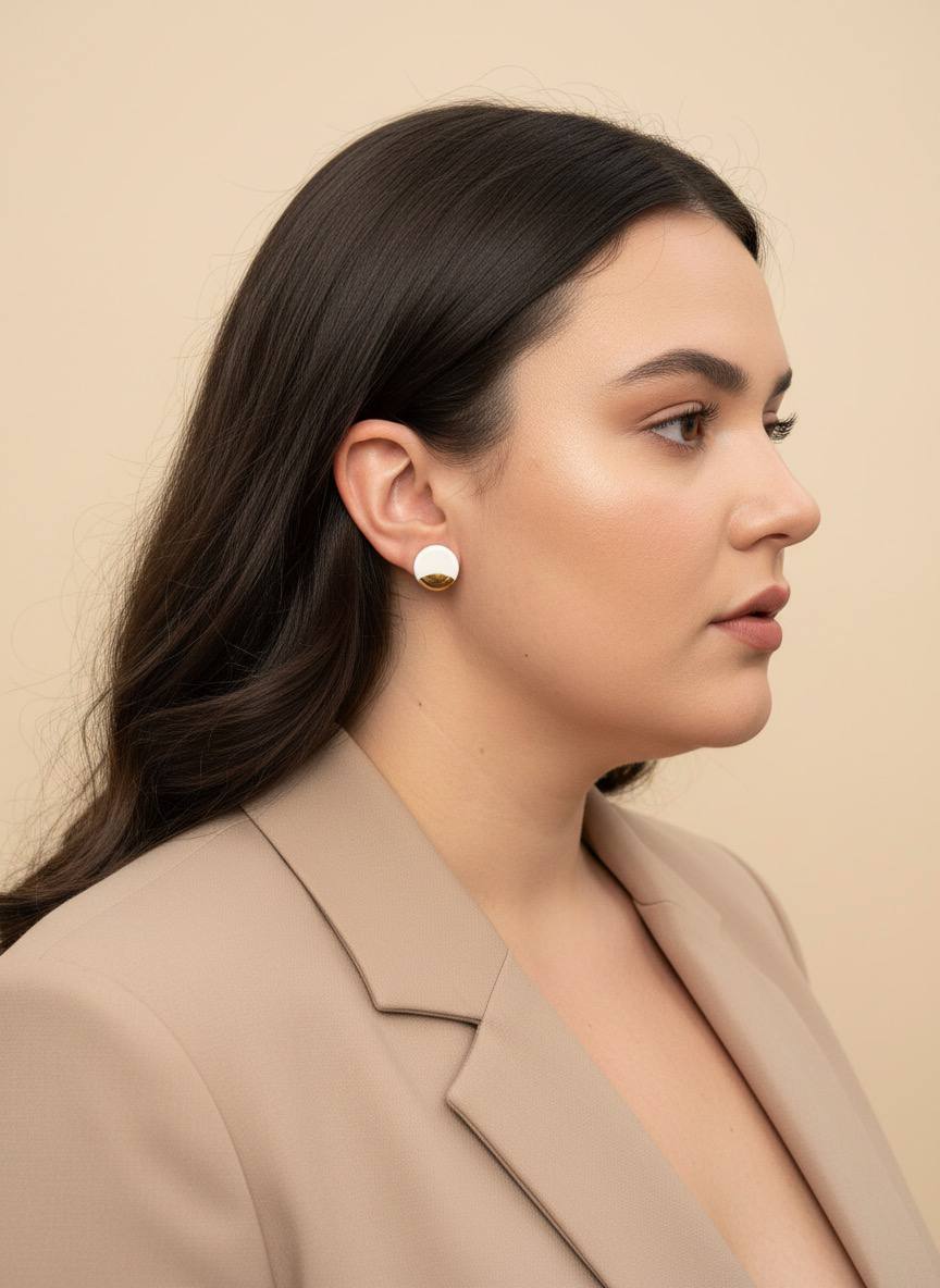 Estos pendientes de porcelana circulares están diseñados como un pequeño talismán cotidiano. La pieza central, fina y ligera, se modela en porcelana blanca y se cuece a alta temperatura para lograr una superficie suave y resistente, casi translúcida en los bordes. Sobre ella, un decoración en lustre de oro real se aplica a mano y se vuelven a cocer para fijar ese brillo cálido y sutil.