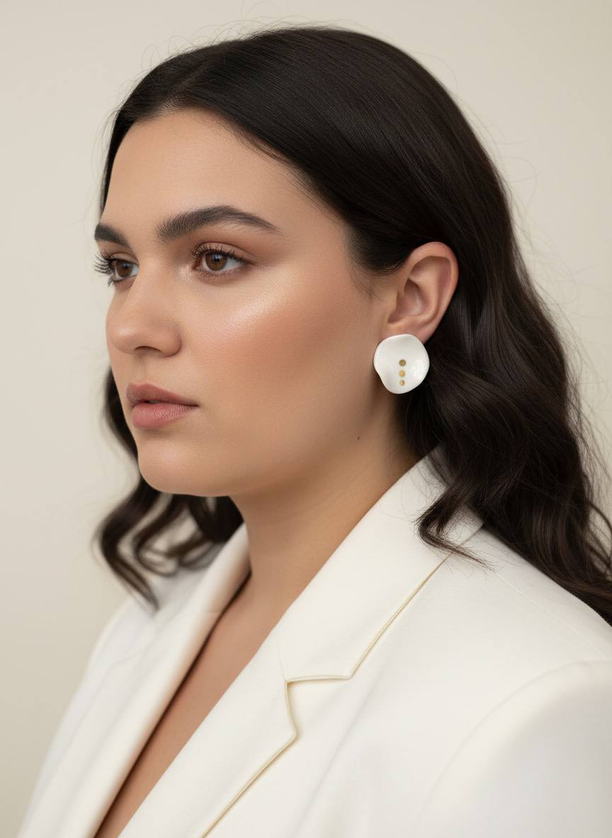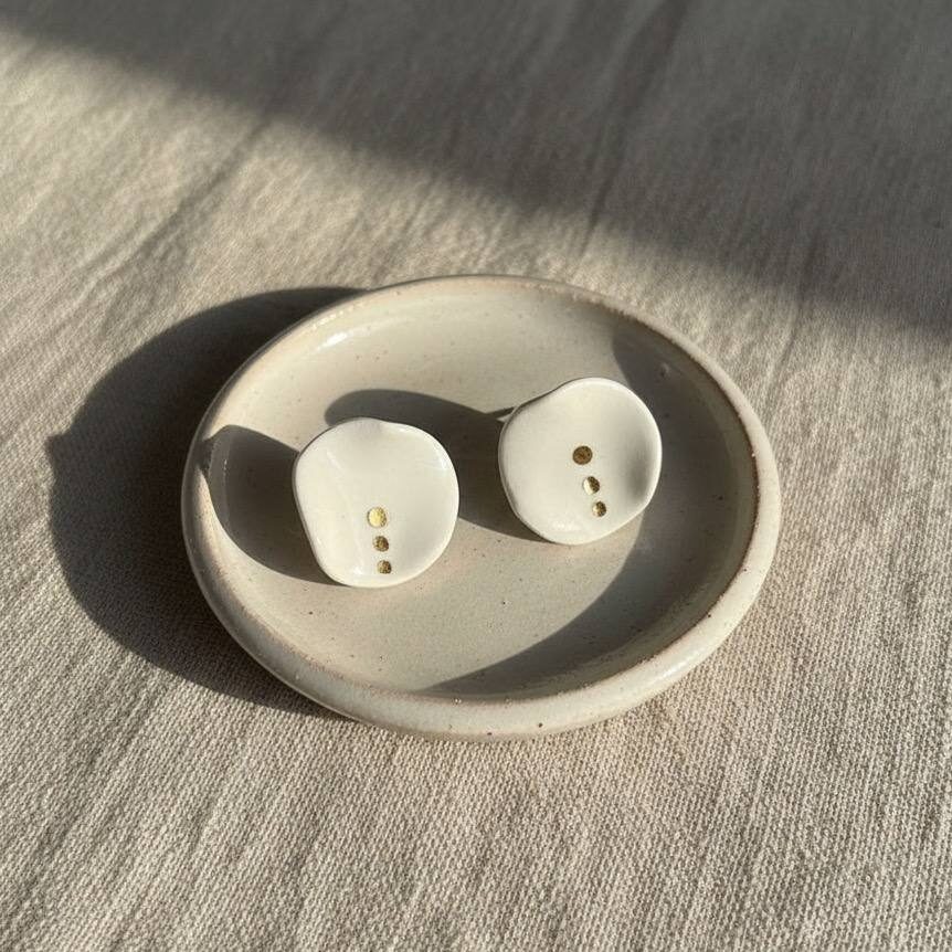 Estos pendientes de porcelana circulares y con ligeras ondas están diseñados como un pequeño talismán cotidiano. La pieza central, fina y ligera, se modela en porcelana blanca y se cuece a alta temperatura para lograr una superficie suave y resistente, casi translúcida en los bordes. Sobre ella, tres puntos en lustre de oro real se aplican a mano y se vuelven a cocer para fijar ese brillo cálido y sutil.