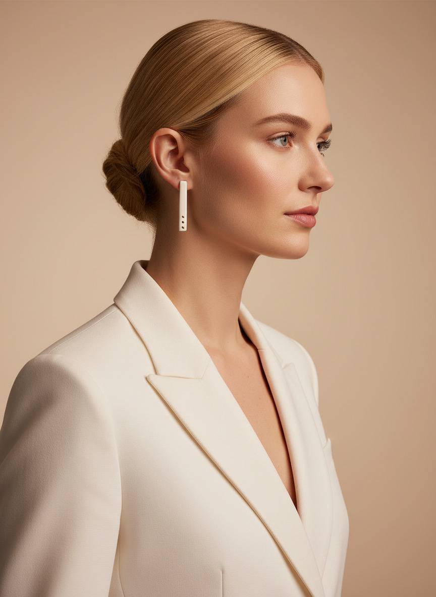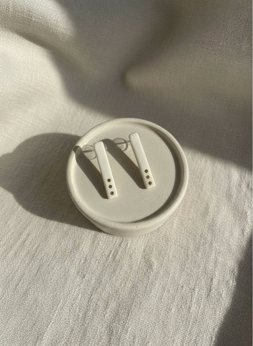 Estos pendientes de porcelana alargados están diseñados como un pequeño talismán cotidiano. La pieza central, fina y ligera, se modela en porcelana blanca y se cuece a alta temperatura para lograr una superficie suave y resistente, casi translúcida en los bordes. Sobre ella, tres puntos en lustre de oro real se aplican a mano y se vuelven a cocer para fijar ese brillo cálido y sutil.